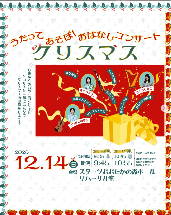 0歳から6歳までのお子様を対象しておられ、お二人ともに一瞬職業選択間違えた人と思うほどお話しが上手、楽器演奏体験、絵本の読み聞かせ、クイズ、リトミックを取りいれ年齢、場所に合わせた演奏活動を展開。音楽のみならず、楽しさと笑顔を届ける活動をされています。